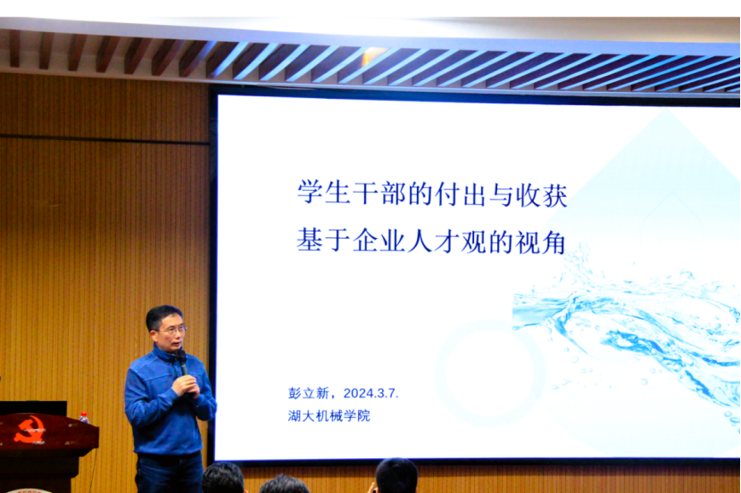 彭立新教授特别强调了担任学生干部的意义和价值。他指出,学生干部是一种宝贵的经历,学生活动可以锻炼学生干部们的领导能力、责任感和团队合作精神。彭立新以一位“老班长”的身份现身说法,通过时间的付出,收获自身的修炼。他提到一位优秀的学生干部应具备的品质,如奉献精神、优秀的情商、协调能力和沟通能力,并鼓励学生干部们在学生工作中砥砺担当、追求卓越。