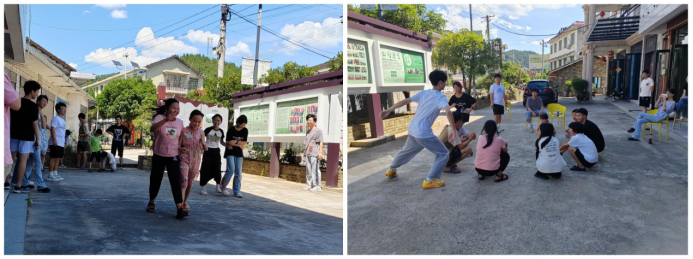 下午,炎炎夏日,团队和孩子们进行户外活动:搬石头过河、蛟龙出海、抢凳子、击鼓传花… 院落里笑声此起彼伏。和油溪桥村鼓励村民为村子做事奖励的制度类似,我们采用积分制,激发孩子们的兴趣,为积分最高的学生颁发湖大文创奖品。