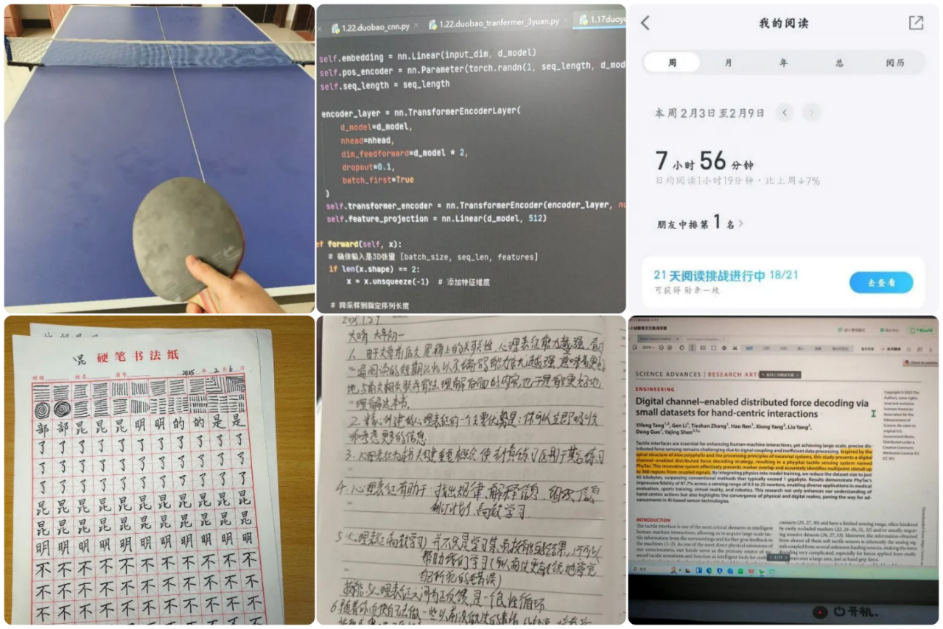 本次活动以“21天习惯养成”为核心理念,鼓励学生通过持续行动提升自我。参与者通过照片记录日常,展现了丰富多彩的假期生活:在健身板块,同学们分享跑步、跳绳、球类运动等锻炼瞬间;生活板块则充满年味,贴春联、大扫除、制作年夜饭等场景传递着新春祝福;学习板块尤为充实,阅读文献、编写代码、练习书法、背诵单词等学习画面彰显了黄色网址