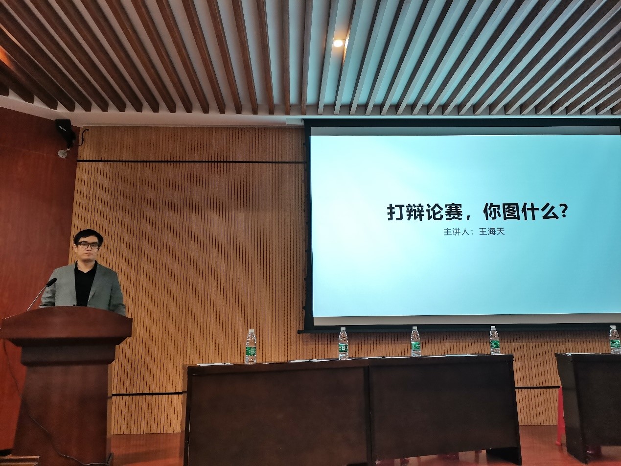 辩论队教练王海天作新生赛宣讲会。从论、辩、赛三个层次为同学们解答了“从辩论中能学到什么”的问题。辩提高了思辨能力,论提高了精准表达能力,赛则帮助提升社会知觉。