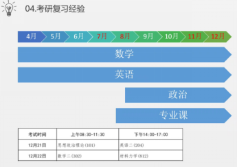 其次分享的内容为考研科目与时间,考研一般分为三项,夏令营、考研初试、考研复试,夏令营是近几年各高校争取优质生源的一种方式,一般为大三下学期5—7月份,各高校利用暑期为期一周左右的时间,与学生进行交流与融合,安排参观实验室,介绍各导师研究方向、学术交流分享等形式,并通过多种方式(例如笔试、面试、实验测试等)来考核学生,以确定是否发放拟录取通知书。虽然每年能通过夏令营被各高校录取的人很少,但是即便没有被录取,夏令营为同学们提供了了解导师的机会和考研降分的益处。考研初试是考研的重点,时间一般为大四上学期12月份,学长建议提前备考,并分享本人考研复习经验。