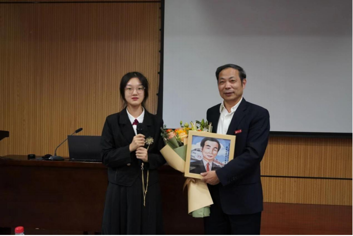 讲座结束,丁院士还鼓励在场同学们踊跃发言,说出自身在大学学习上遇到的问题,场下同学们积极举手发言,丁院士一一对其进行详细的解答。等到讲座结束,能源2201张晓斌、力学2022班胡薇同学代表22级全体新生分别向丁院士送上了精心准备的花束和亲手绘制的丁院士的画像,以表达对丁院士的感谢。