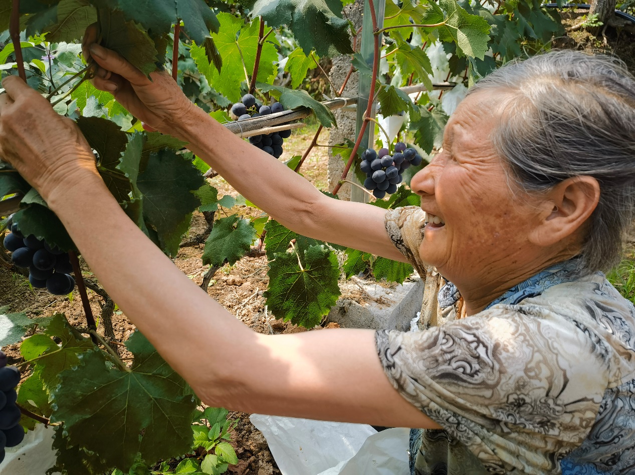 了解并观察了唐奶奶家的葡萄后,唐奶奶很热情地摘下一大串葡萄让调研团队尝尝。尔后调研团队与奶奶告别,调研团队成员祝福奶奶健康长寿。奶奶也祝调研团队的活动顺利,收获多多。