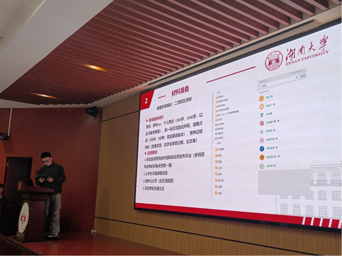 首先进行经验分享的是范蕴宝和窦浩轩同学。他们详细介绍了保研前所需的准备,如湖大邮箱、个人简历、中英文的自我介绍等。窦浩轩同学也向大家推荐了制作简历的软件以及了解各校保研资讯的公众号。同时两位分享了自己保研的时间线以及在夏令营和预推免的面试中所遇到的环节和问题并为在场同学提供择校建议与避坑指南。