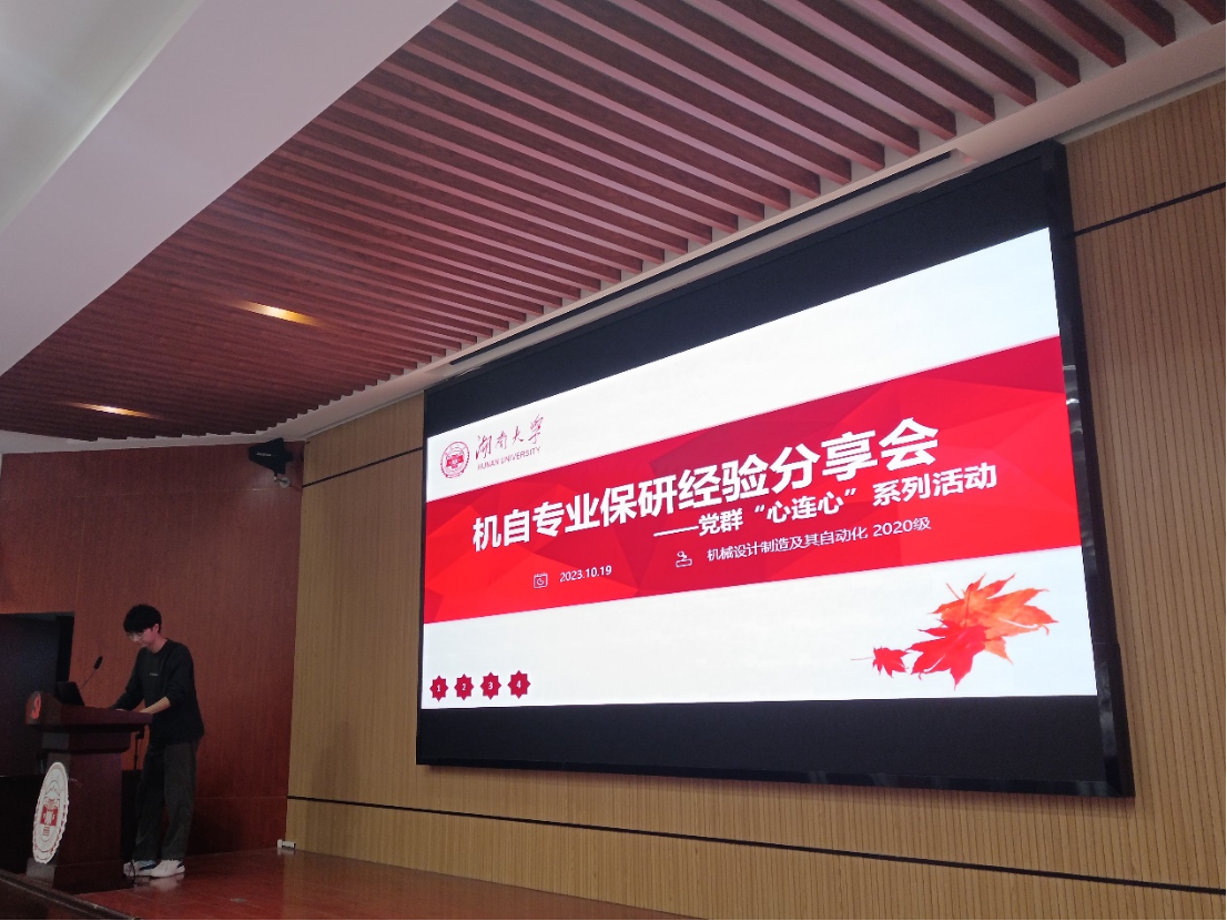 红色引擎党建服务中心联合机自第一、第二党支部联合举办,汪鑫同学主持,机自专业20级本科生范蕴宝、窦浩轩、赵鑫杰、杨少晨四位同学在现场分享自己保研的经验。