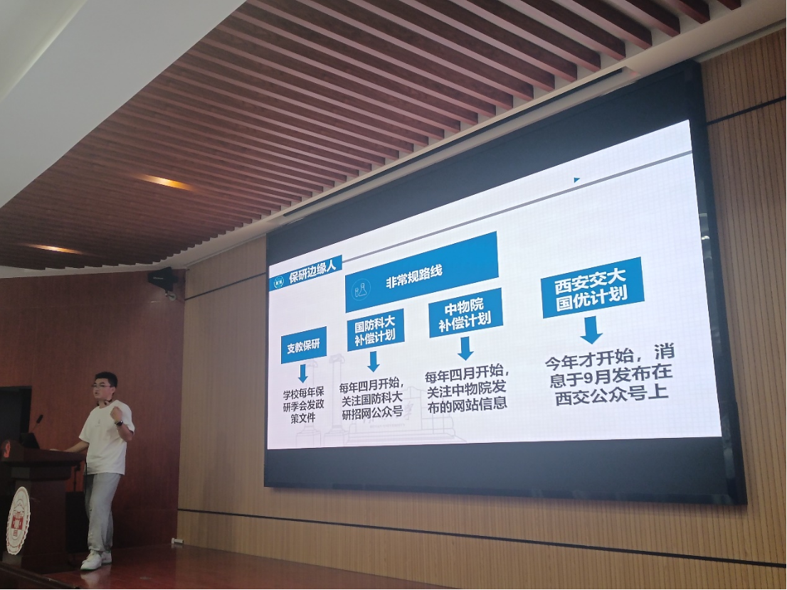 紧接着进行经验分享的是杨少晨和赵鑫杰同学。杨少晨同学着重强调了在面试中无论面对什么古怪晦涩的问题都要保持镇静与自信,联系所学内容从容应答即可,并提醒参会者要注重自我推销和展示自己的能力。赵鑫杰同学着重分享了对于转专业和处于保研边缘的同学们保研技巧,向同学们介绍了支教保研以及补偿计划的相关政策。