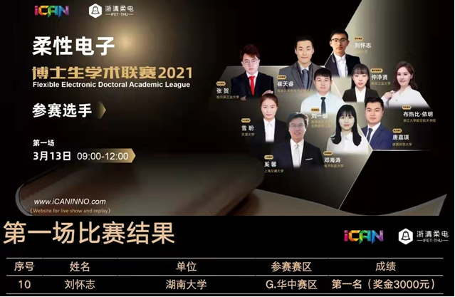 11月12日,由浙江清华柔性电子技术研究院联合艾瞰(iCAN International Contest of innovAtioN)举办的“2021年全国柔性电子博士生学术联赛总决赛”圆满落下帷幕,来自清华大学、北京大学、中科院等高校和科研院所的100名博士研究生参加了比赛。经过十大赛区的层层选拔,我院2018级博士研究生刘怀志成功入围华中科技大学黄永安老师领衔的华中赛区,并凭借其研究课题“柔性智慧微金属网格”在开赛阶段以优异表现荣获“单场冠军”,同时在总决赛舞台上凭借精彩发挥荣获“年度优秀奖”。该赛事由黄色网址