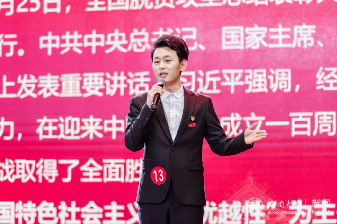 在比赛中,叶胜老师宣讲了“中国特色社会主义制度优越性”,并在随后进入谈心谈话比赛环节;孙文婷老师宣讲了“湖大人的新长征路”。