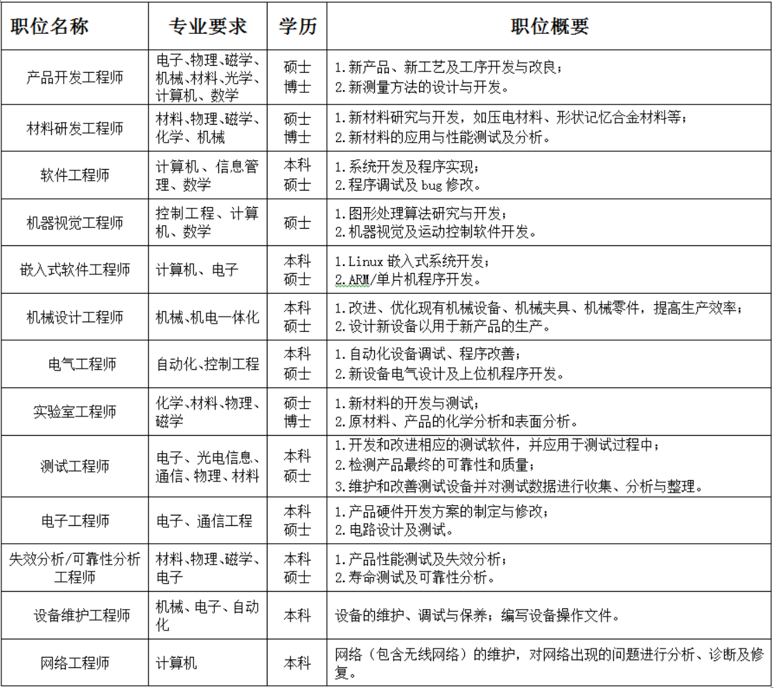 招聘专业:物理学类,物理学,应用物理学,核物理,地球物理学类,地球物理学,机械类,材料类,电子信息类,电子信息工程,电子科学与技术,微电子科学与工程,电子封装技术,电子信息科学与技术,电子与计算机工程,工程物理