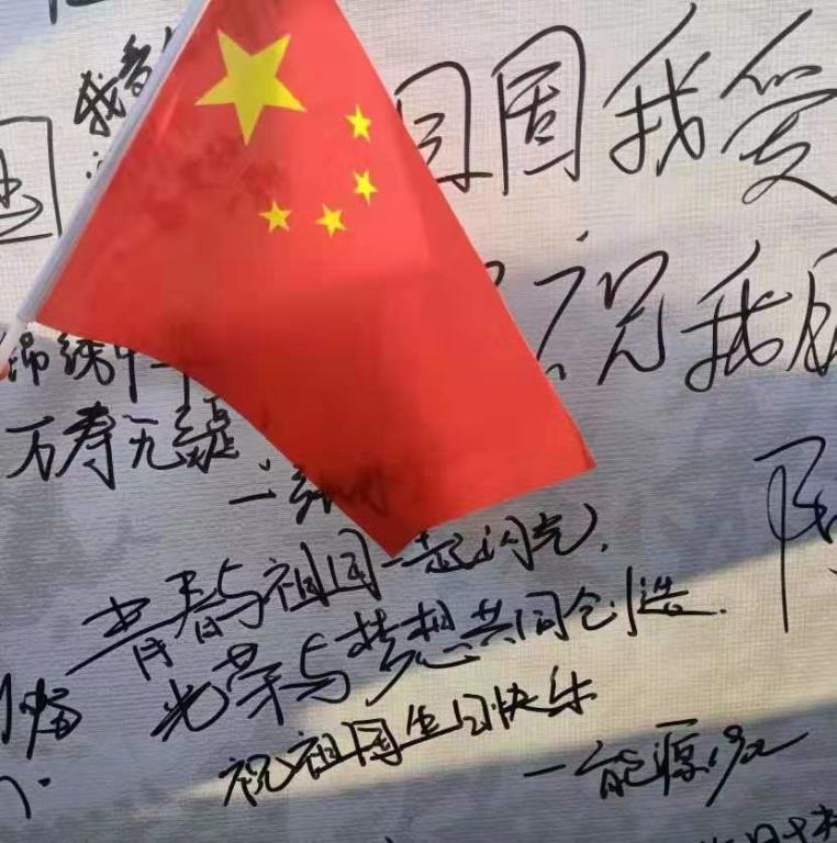 在9月30号当天清晨,在学院领导及江慧天营长的指挥下,学院学生高唱《我和我的祖国》。随后在签名墙上写下对祖国的告白以及在留影墙前合影留念。