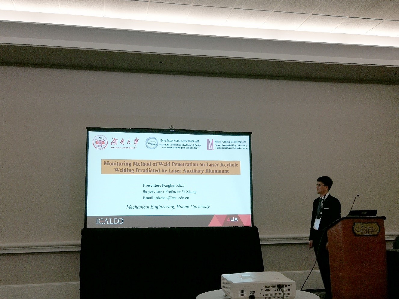 团队博士生赵鹏辉参加第38届国际顶级会议International Congress on Applications of Lasers & Electro-Optics (ICALEO2019 ),并做题为” Monitoring Method of Weld Penetration in Laser Keyhole Welding Irradiated by Laser Auxiliary Illuminant ”Oral Presentation. ICALEO会议为激光加工领域一年一度的国际顶级学术会议,与会人员超过500人,其中包括激光加工领域的世界顶级专家和世界激光加工领导企业代表,学术报告超过200场次。
