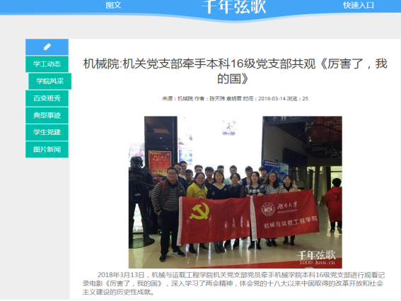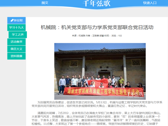 支部重视用党的理论知识武装干部,支部书记带头组织学习《党章》、《廉洁自律准则》、《纪律处分条例》等党内最新文件,加强思想建设、组织建设, 深入开展了“两学一做”等专题教育活动,营造了浓厚的学习氛围,提升了党员干部的思想觉悟。支部党员在经常受到理想信念教育、党性教育、党的优良传统作风教育、怎样做一个合格党员的教育,增强党员的党性观念,加强党性修养,从而在各项工作中自觉地发挥先锋模范作用。注重知行结合,打造全方位学习平台。联合国防生、力学系教工等支部开展“微党课”“赴湖南省苏维埃旧址学习”“庆祝建党96周年知识竞赛”等“两学一做”主题学习教育活动,拓展及规范活动阵地建设,加强了学习教育,拓展了机关支部的中枢作用和服务功能;注重文化育人职能,赴湖南省博物馆开展“传承湖湘文化,争做时代先锋”主题实践活动;结合实时热点开展学习,在十九大、两会等期间,机关党支部同志学习心得多次在黄色网址