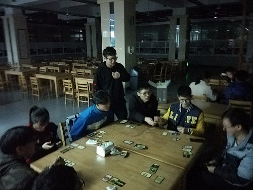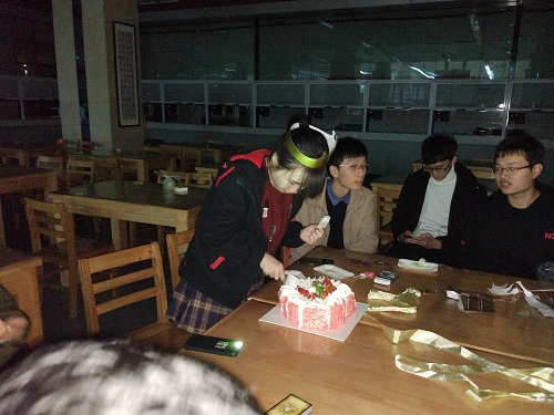 九点的时候,同学们都守时地到达目的地,聚会便开始了。同学们打开蛋糕,点上蜡烛,唱起了生日歌,温馨的气氛让大家忙碌的心得以在港湾停靠。而之后,便是分蛋糕的时间,蛋糕很甜,而心更甜。同时,为了让现场氛围更加愉快更加轻松,有同学带上了三国杀等桌游,大家都参与了各种游戏,并且指导今天的寿星公参与未曾玩过的卡牌游戏,现场一片欢声笑语。