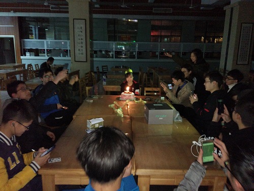 爱戴女生的优良传统,决定在本周日晚上一起隆重地为班上三朵金花之一的杜卓颖同学庆祝生日。聚会前班委与其他成员们积极筹备,统计人数、约定时间、定制蛋糕、摆放场地等等。大家在劳动中增进友情,在合作中感到快乐。