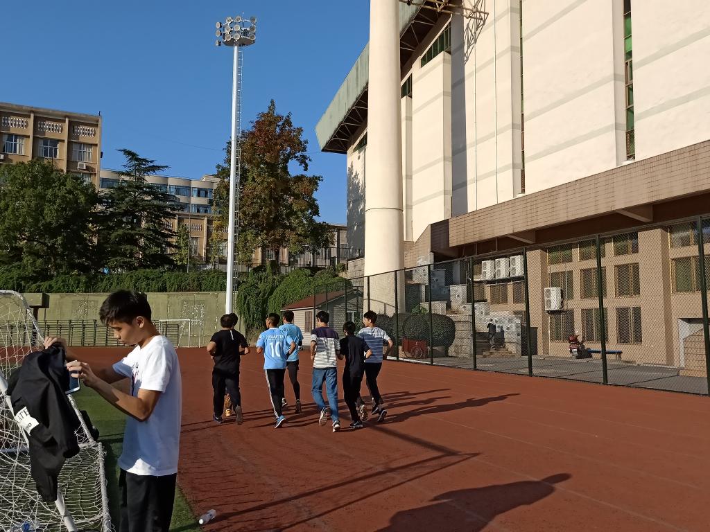 下午的阳光并不刺眼,反为这暮秋的天空添了几分暖色。阳光下运动员们的身影在红色跑道上描了一遍又一遍,汗水挥洒,落日晚霞,辉映着青春的面庞,无悔前行!