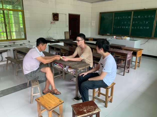 课程结束之后,志愿者们走进乡村,开展调研。他们聆听了当地党支部书记对学校的近况的介绍,也为村党支部赠送了3D打印的党徽模型。在与支部书记的沟通中,成员们了解到村子近年来基础设施虽然得到改善,村子的生活条件逐渐有了保障,但是教育问题依然严重,生源流失、教育资源匮乏仍然是困扰着黄金洞村教育发展的症结。结束访谈后,成员们走进困难学生的家庭中。与孩子家长的谈话中,队员们认识到,双青完小学生的父母大多在外打工,收入微薄且不稳定,对子女和老人缺少照顾。有的家中的唯一劳动力在打工中发生意外,且因为缺乏法律意识未签订有效的劳动合同而难以获得经济赔偿,使家庭生活陷入了困顿。成员们无不为他们的遭遇感到同情和扼腕,决定以更积极热情的态度投入到后续的志愿活动中,希望在返校后号召更多的社会力量参与到乡村扶助的公益事业中去。