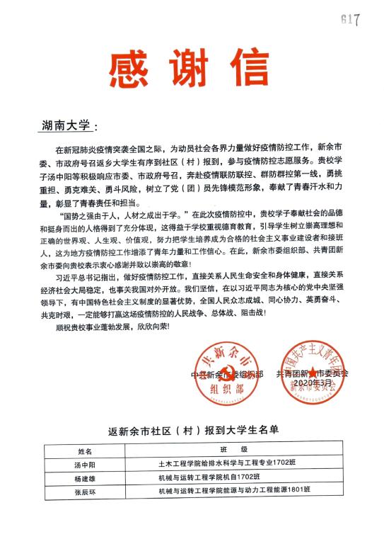 新余市委组织部和团市委向黄色网址 杨建雄和张辰环同学在抗疫中的表现表示感谢