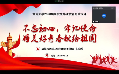 党委书记彭晓燕在线上为即将毕业的研究生毕业生上了一堂主题为“不忘初心,牢记使命,将美好青春献给祖国”思政课。