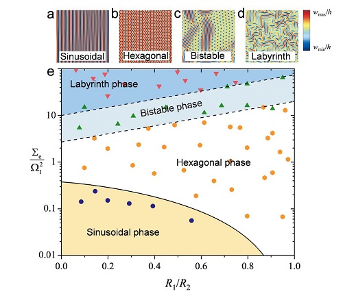基于之前的研究工作(JMPS 2014, 73, 212-227; Soft Matter 2016, 12, 7977-7982),赵岩副教授、姜潮教授与清华大学曹艳平教授、冯西桥教授在浅壳理论的基础上建立了适用于一般曲面软材料系统表面失稳的控制方程,系统研究了曲率对表面失稳的影响,并发展了傅里叶谱方法追踪系统随载荷增加时的形貌演化。与球表面失稳现象不同,对于一般曲面,由于曲率各向异性的存在,在等轴双轴压缩载荷下系统会首先出现正弦失稳模式,随着载荷增加,正弦失稳形貌会向六方形貌演化,并最终演化为迷宫状失稳形貌。通过理论分析与谱方法建立了软材料系统失稳形貌演化的完整相图(图1)。
