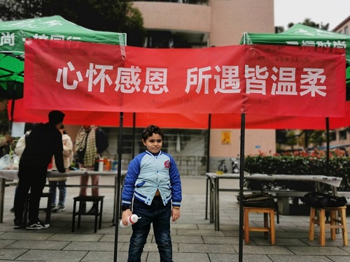 下课的学生、过路的老师、外国母子......从布置好场地直到结束,这项活动吸引了许许多多心怀感恩的人,整个活动的氛围愉快轻松。女生们结伴而来,欢笑打趣的讨论,写下对彼此的感谢;也有参与进来的男生,一笔一划写下最真挚的祝愿和对未来生活的期许。